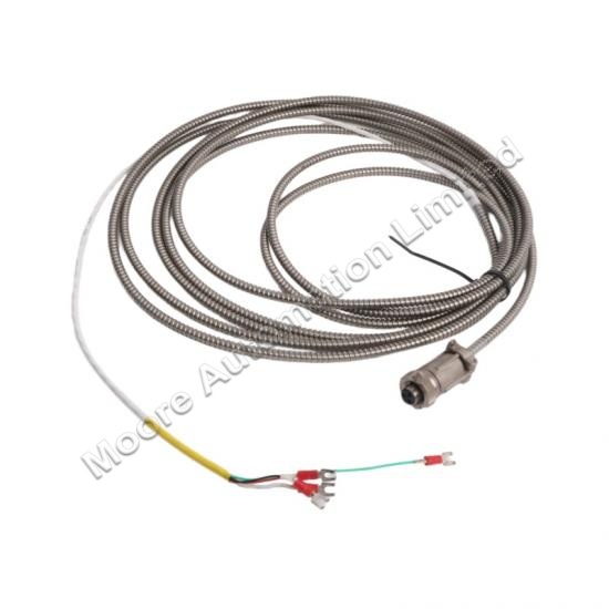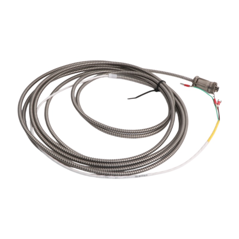 The Bently Nevada 16710-21 Interconnect Cables featuring a 3-conductor shielded 22 AWG (0.5 mm²) armored cable. One end of the cable is equipped with a 3-socket plug, while the other end features terminal lugs for easy connection to monitoring systems. These cables are available in lengths ranging from a minimum of 3.0 feet (0.9 meters) to a maximum of 99 feet (30 meters), providing flexibility for various installation needs.