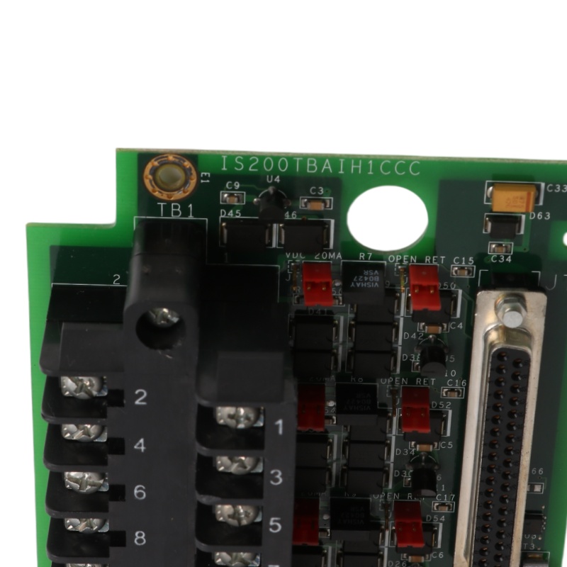 IS200TBAIH1CCC is an analog input terminal board developed by GE. It is a part of Mark Vle control system. The Analog Input Terminal Board is designed to support a total of 10 analog inputs and two outputs, offering a versatile interface for various types of transmitters. These inputs accommodate two-wire, three-wire, four-wire, or externally powered transmitters, ensuring flexibility and compatibility across different transmitter configurations. Moreover, the analog outputs can be configured for either 0-20 mA or 0-200 mA current output settings, providing adaptability to diverse operational requirements.