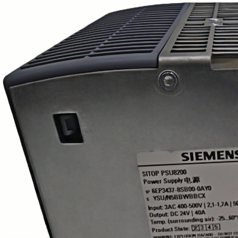The 6EP3437-8SB00-0AY0 power supply, part of its SITOP range. This component is designed to operate within an input voltage spectrum of 400 to 500 VAC and draws 2.1 A at 400 VOLTS. It supports a dual frequency of 50/60 Hz, making it versatile for various applications.Outputting a steady 24 VDC, this power supply delivers a substantial output current of 40 AMP, fulfilling the power needs of connected devices effectively. With a maximum power rating of 960 W, it is well-suited for demanding electrical tasks. The device ensures minimal disruption with a startup delay capped at 0.1 seconds, allowing for quick readiness.